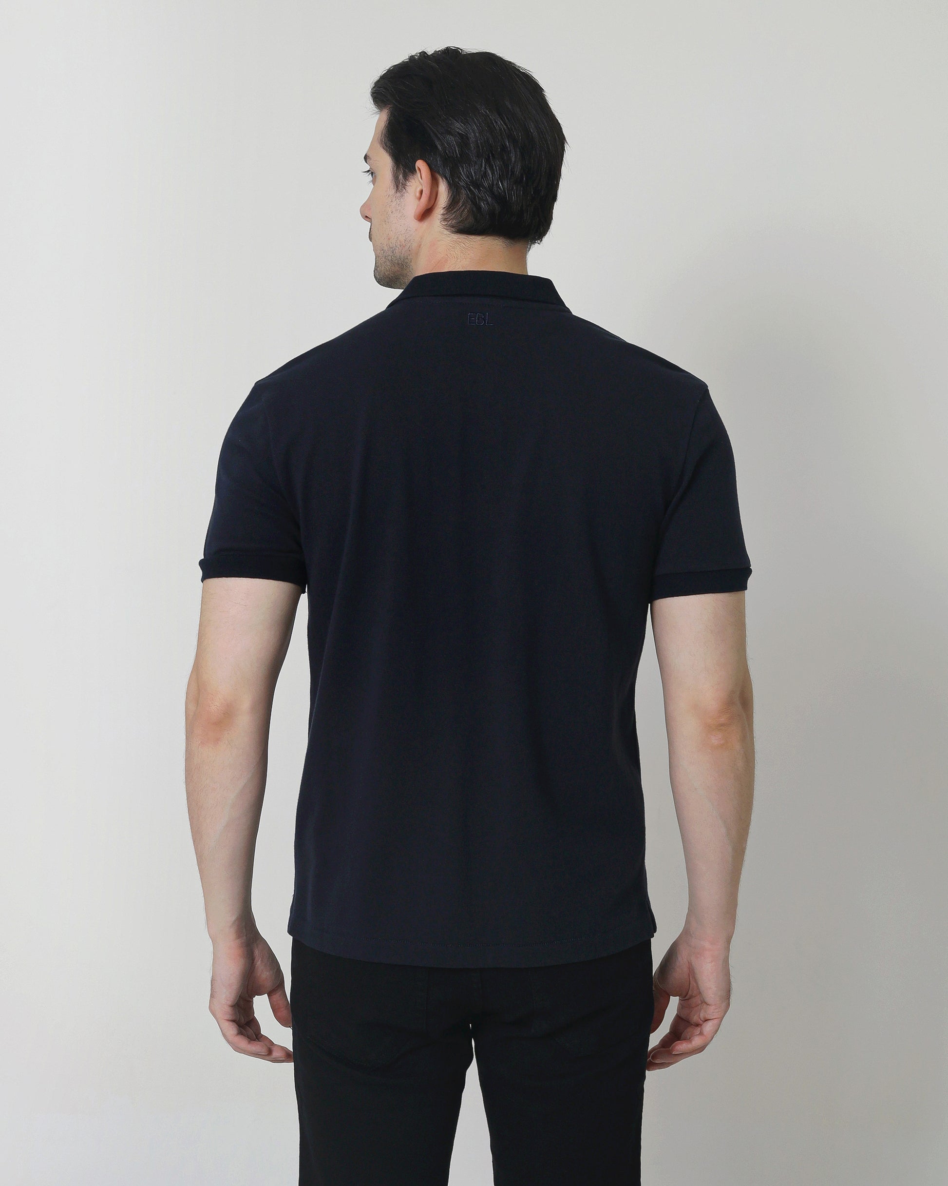 - Subtle EBL monogram embroidery under rear collar
